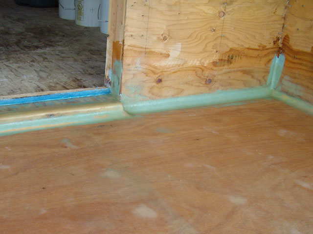 | Feb. 3. Close up, the inside corners on the deck have fillets of fiberglass. The fillets will resist cracking, a common problem. | |
