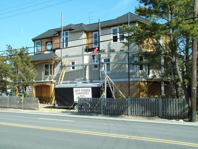 | Mar 3. While it has been too windy to be out on the scaffolds, shingles have been applied around the first floor front deck. | |
