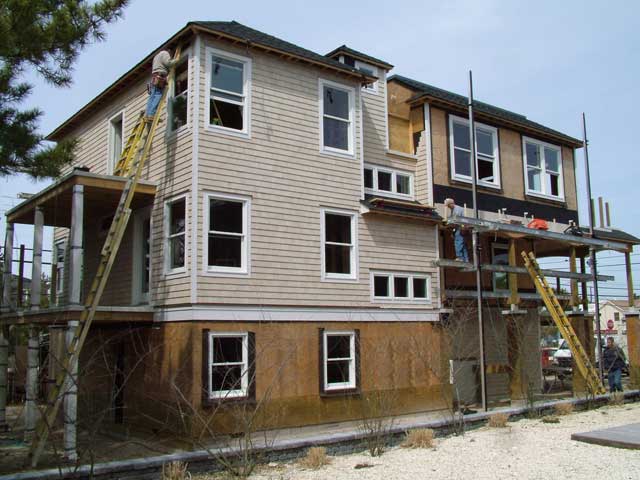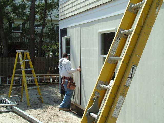 | Apr 5. The lower level exterior is being covered with 4x8 cement board panels. The electric meter box is also in place (middle of picture). | |