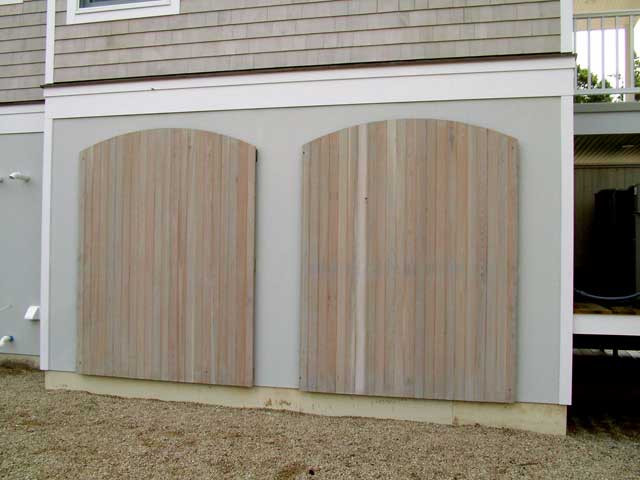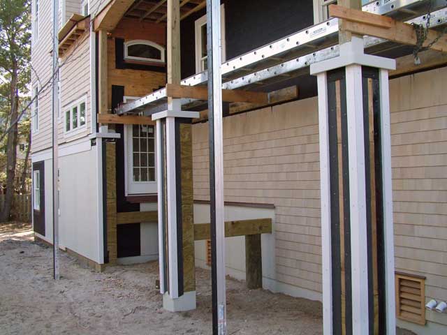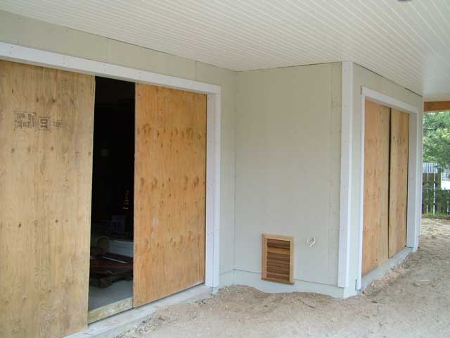 | Mar 3. Since the flood vents are now required by code to be so large, it's good that we could use cedar louvers, like this one. Next to it are the discharges from the front deck drains | |