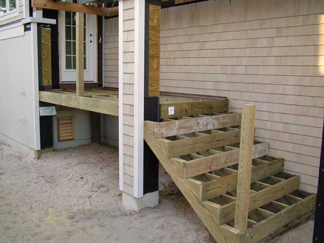| Apr 19. Jeff has also put in the platform and stringers for the entry. The deck & steps will be made of tropical ipé with red cedar risers. | |
