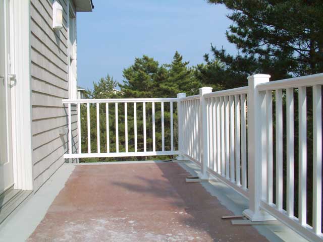 | June 24. Here is the WeatherBest railing on the 2nd floor front deck. Despite the steep installation learning curve, the finished product is very, very solid. | |