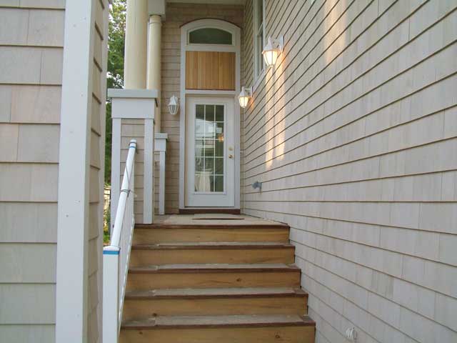 | May 19. The front entry now has the tongue & groove red cedar above the door and the ipé deck & stairs. | |