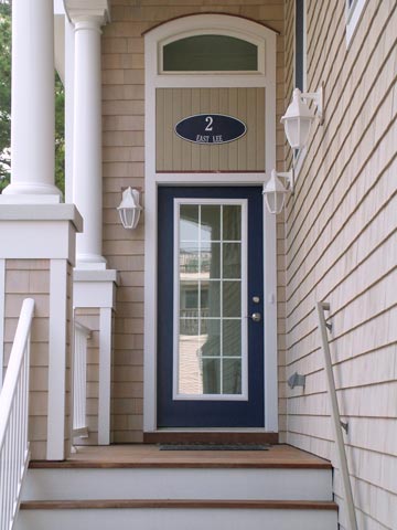 | Aug. 12. Do we know how to make an entrance? Actually, we don't- without a lot of help. Cindy picked the color, Ben Moore Symphony Blue, for the door and the plaque. | |