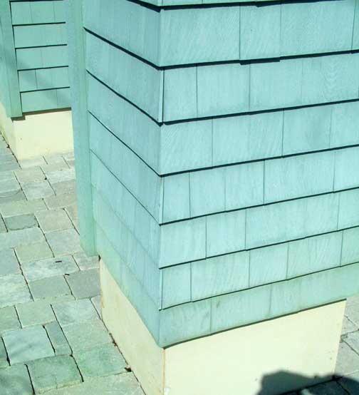 | April 16, 2004. Detail of Beach Haven house cedar shingles on front columns. Shows very nice weave corner, as well as corner board finish in background. | |