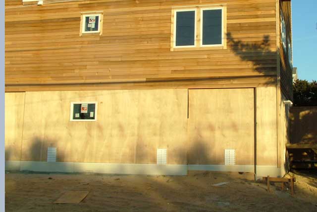 | April 05, 2004. Cedar paneling covers ground level exterior at another house just built on the Boulevard. This strikes me as looking unfinished and right at eyelevel. The furshlugginer flood vents don't help. | |