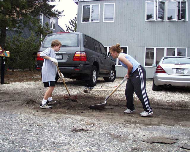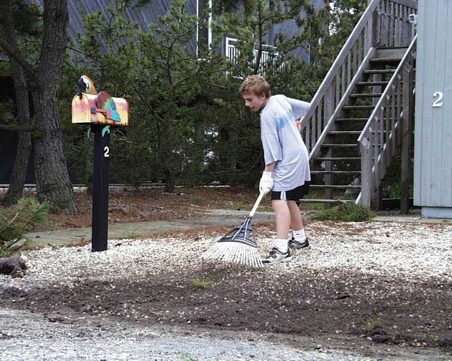 | May 10. Austin raking the landscape gravel. | |