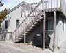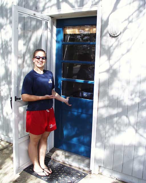 | May 20. Jackie shows off the studio unit door that she refinished. I replaced the exterior door trim with vinyl composite (eternally white and rot-proof). The trees covering this area have been trimmed back to allow more light and keep things drier. | |