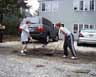 | May 10. Jackie and Austin discover the long-buried street curb. This is our first work weekend at the house. | |